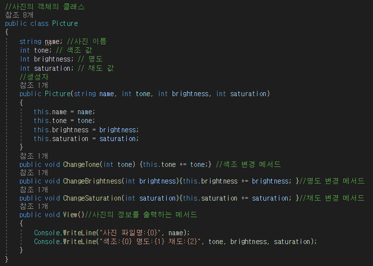 -Picture 클래스 사진의 정보(변수)를 가지고 매개변수를 받아 변수를 변화시키고 정보를 보는 메서드를 가지고 있다.