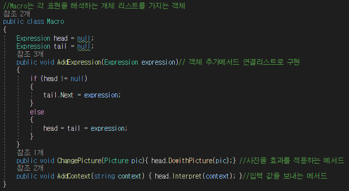 -macro 클래스는 Expression의 파생클래스을 연결리스트로 만들어 가지고 있는 객체로 리스틀 추가하고