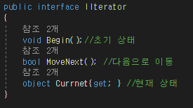 - IIterator인터페이스는 컬렉션 속성에 포함되어 컬렉션을 순회하기 전에 사용하는 메서드와