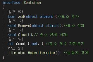 -IContainer 인터페이스는 추상된 컬렉션으로 보관하는 메서드와 삭제, 전체 해제,