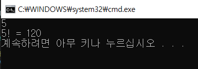정수 n을 입력받아서 팩토리얼을 구하기