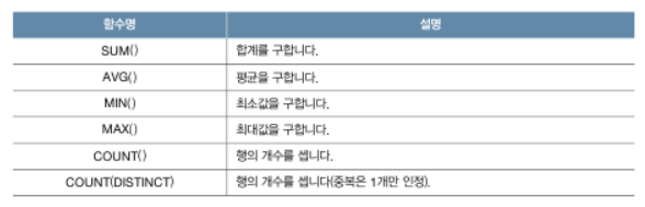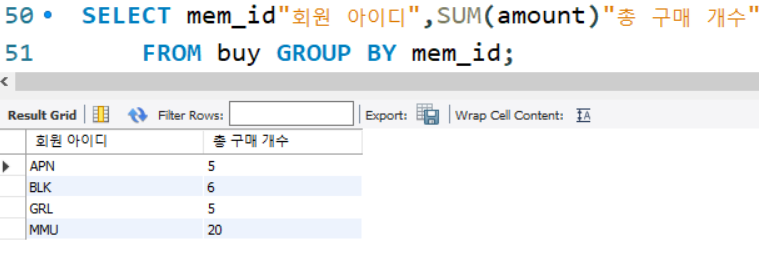4)GROUP BY: 지정한 열의 같은 데이터를 끼리 묶어서 결과를 반환하는 구문.
