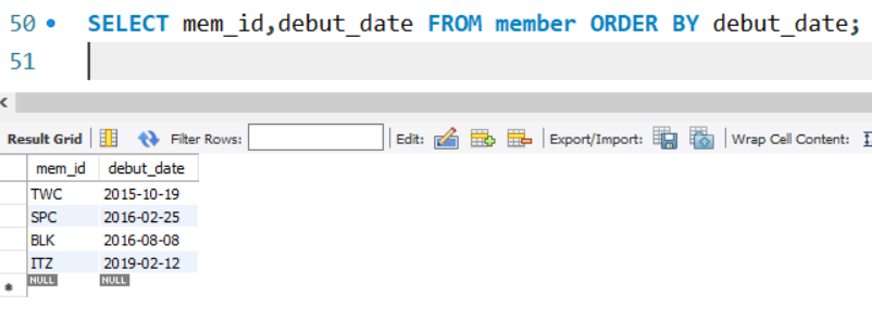 -기본적으로 정렬 순서는 오름차순(ASC)으로 날짜가 작은 순서부터 출력.