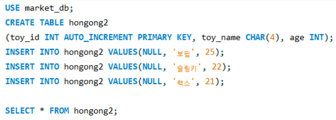 -열에 AUTO_INCREMENT를 넣으면 정의할 때 1부터 증가하는 값을 입력해준다.
