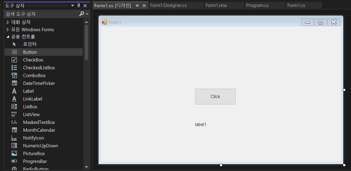 도구상자에서 라벨과 버튼 추가