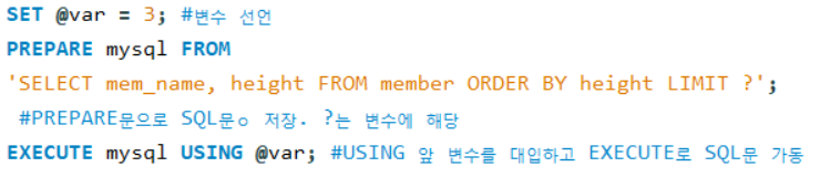 -PREPARE은 SQL문을 문자형으로 저장하고 EXECUTE로 실행시킬 수 있다.