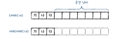 -CHAR는 선언된 자릿수 만큼 자리를 차지하지만 속도가 빠르고 VARCHAR는 배분된 공간만큼 사용하지만 속도가 느리다.