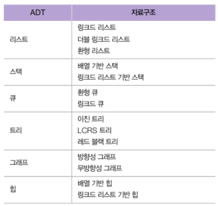 - 유사한 동작을 가진 자료구조의 클래스에 대한 수학적 모델 또는 자료구조가 갖춰야 할 일련의 연산.
