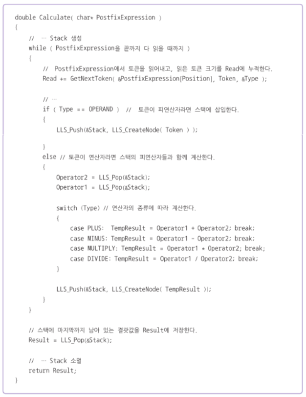 2)연산자가 나타나면 스택에서 피연산자를 꺼내 연산을 실행하고 그 결과를 다시 스택에 삽입