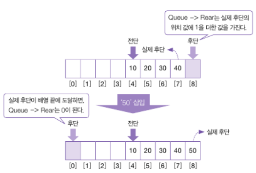 -큐의 최대용량보다 현재 용량이 적으면 추가되는 후단의 위치를 앞으로 보냄으로써 문제가 해결된다.