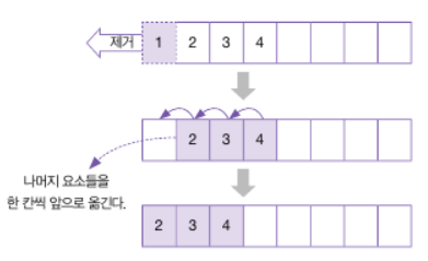 -배열을 이용해서 큐를 구현하다면 아래의 그림과 요소를 제거하는 상황에서 요소를 다음 칸으로
