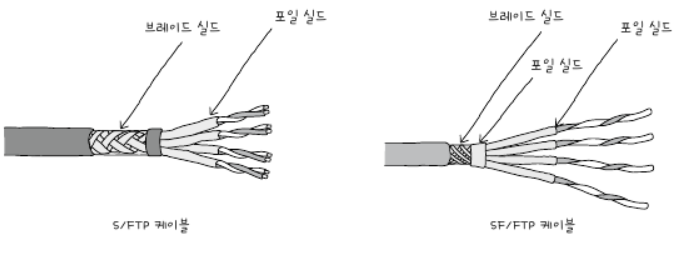 -SF/FTP 케이블:케이블 외부를 브레이드 실드 및 포일실드로 감싸고 각 구리선은 포일 실드로 감싼 케이블.