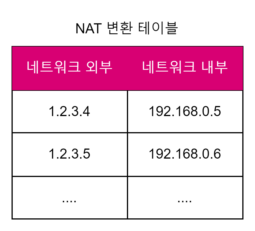 -변환의 대상이 되는 일대일 IP주소 쌍이 존재하며 NAT 변환 테이블 이라고한다.