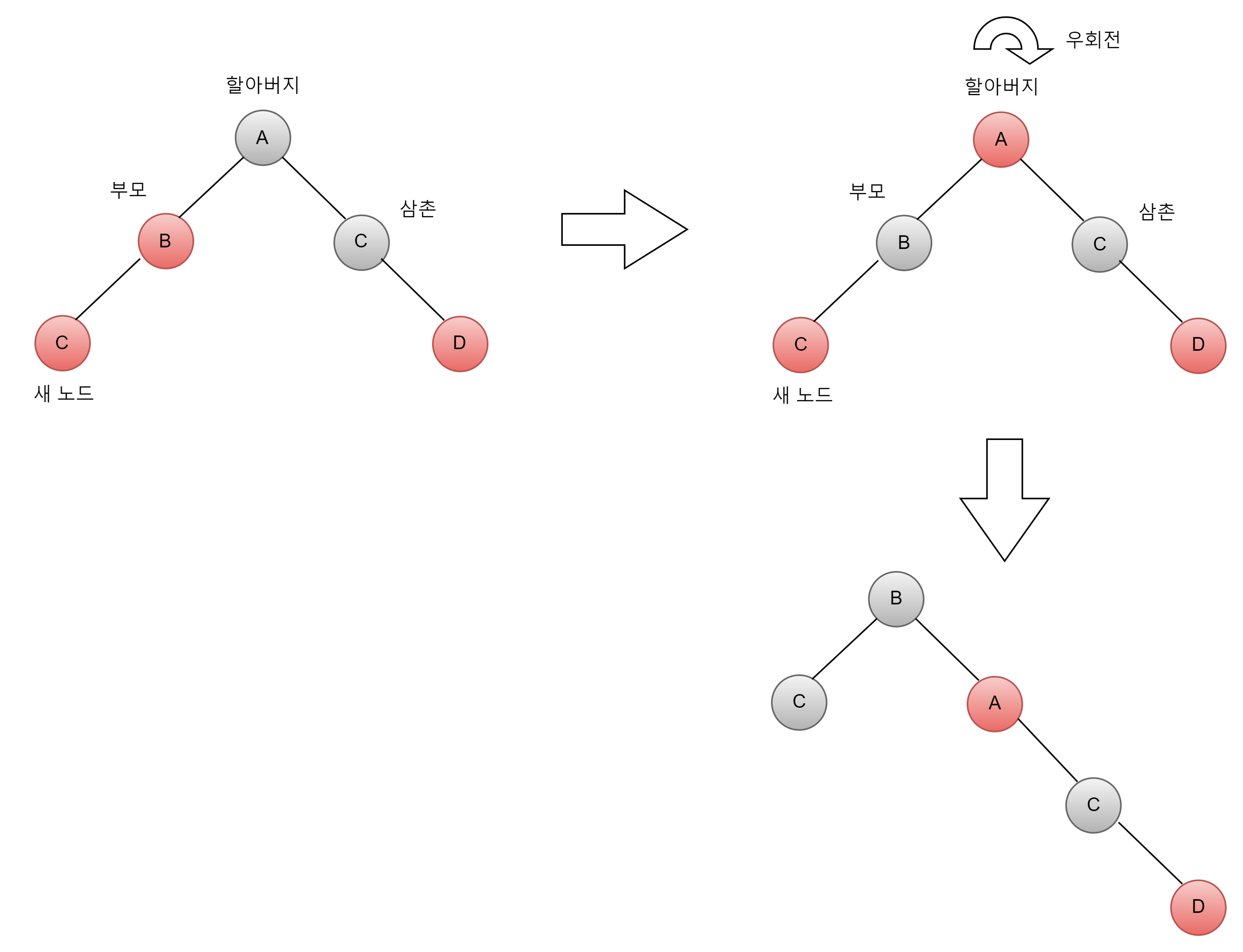-부모 노드를 검은색으로 할아버지 노드를 빨간색으로 바꾼 뒤 할아버지 노드를 우회전한다.