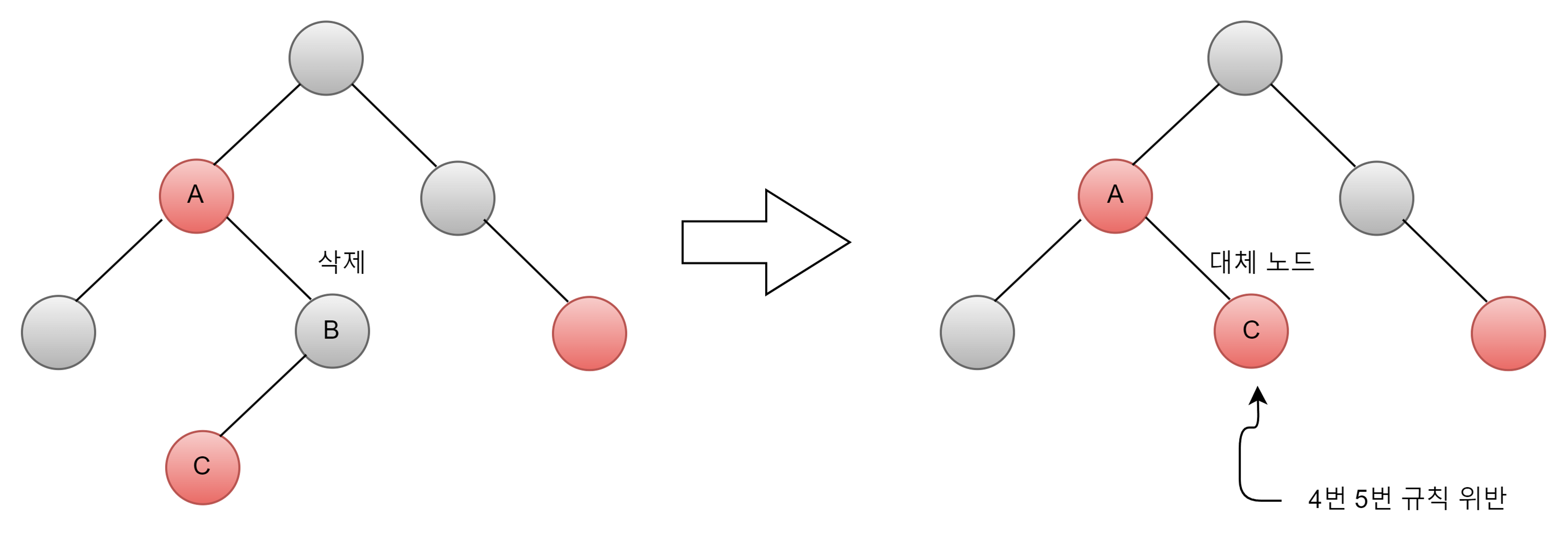 삭제된 노드의 부모 자식이 빨간색이라면 4번 규칙 또한 위배되게 된다.