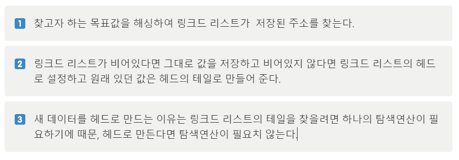 -체이닝은 데이터를 해당 주소에 있는 링크드 리스트에 삽입하여 문제를 해결하는 개방 해싱 방식의 기법.
