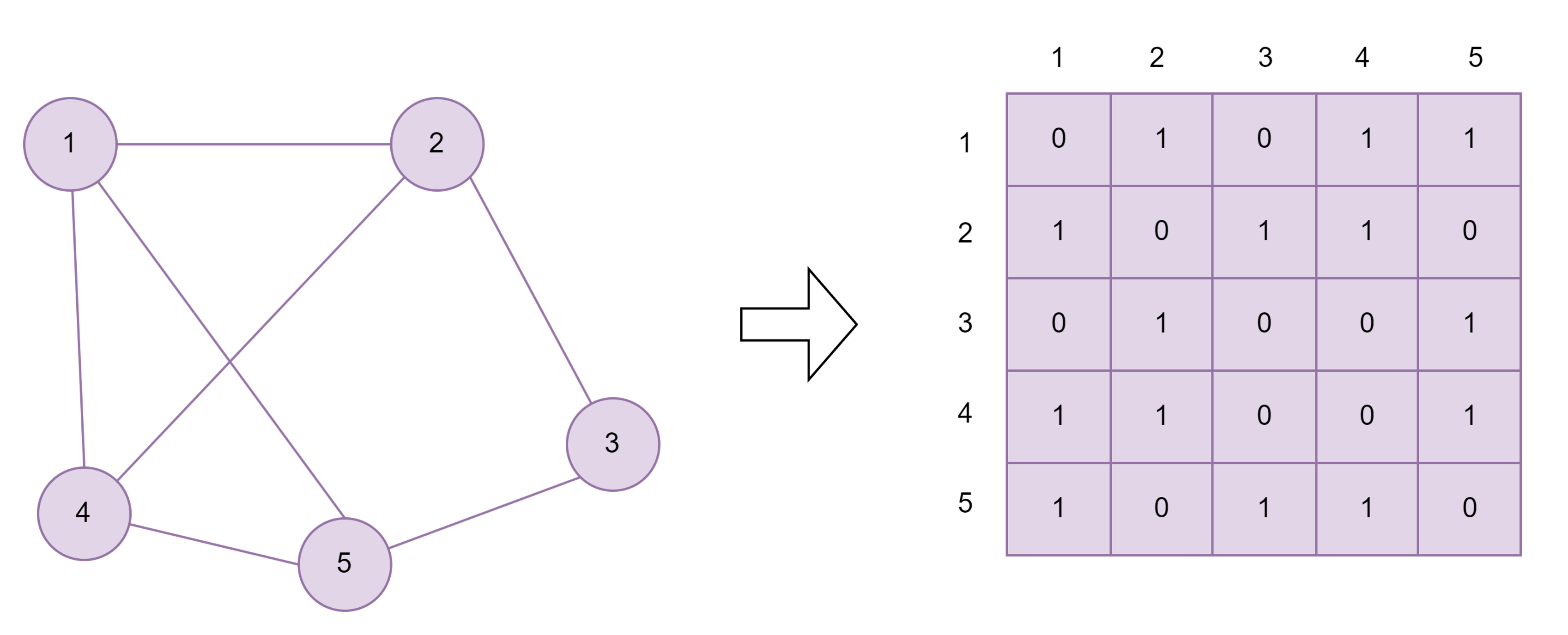 -그래프의 정점 수를 N으로 할 때 N x N 크기의 행렬을 만들고 간선이 존재를 1의 요소로 표현한 것.