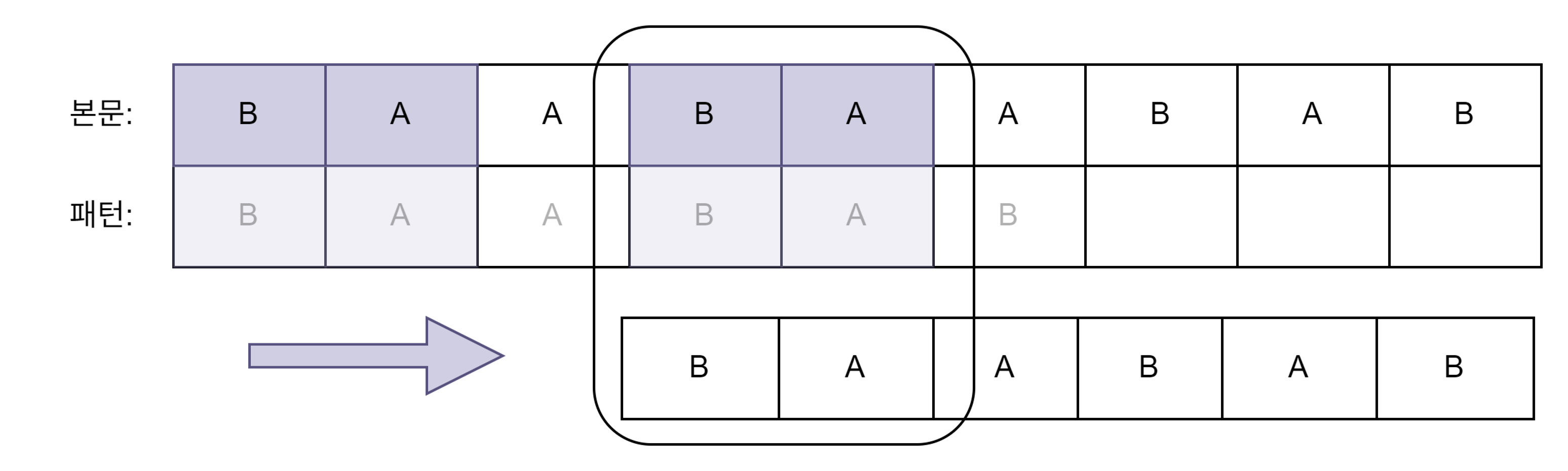 -탐색할 때 본문과 패턴이 일치하지 않았다면 일치하는 경계에서 패턴의 접두사 부분을 접미사 부분이동시켜 다시 탐색하는 것 반복한다.
