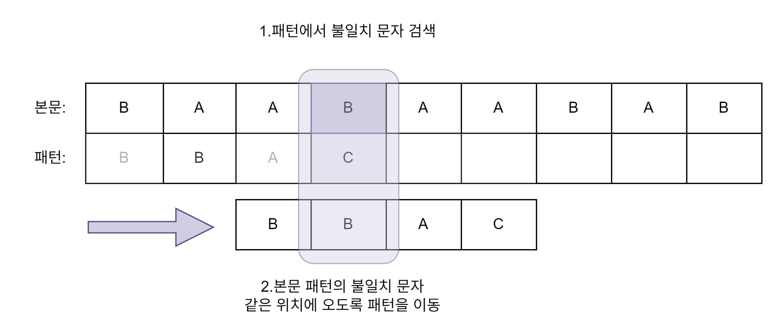 -패턴의 오른쪽 부분부터 검사하여 본문 문자열과 패턴 사이의 매치되지 않은 문자를 나쁜문자라고 뜻하고 이 문자를 이동하는 것을 말한다.