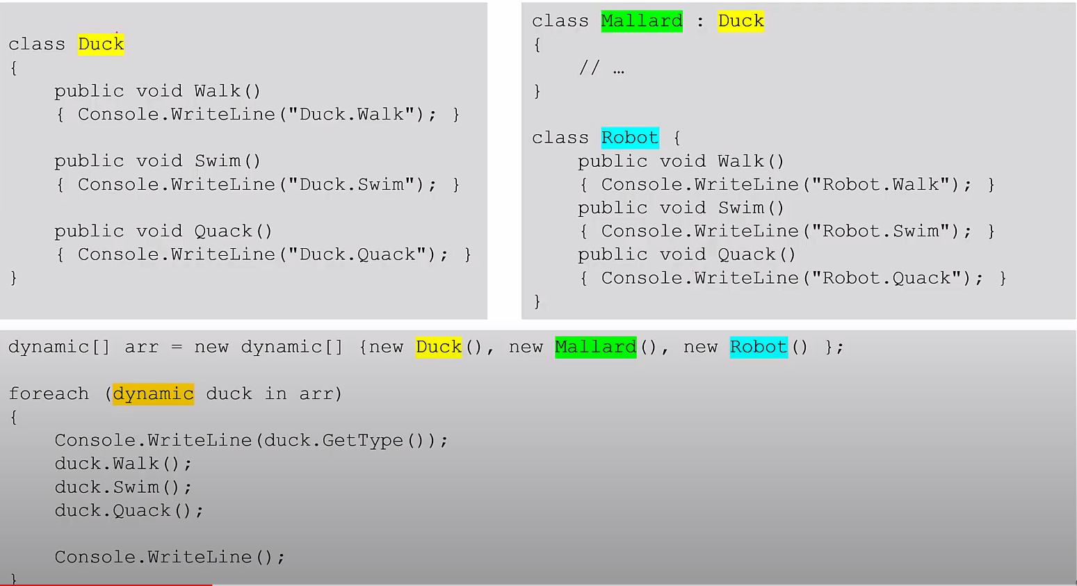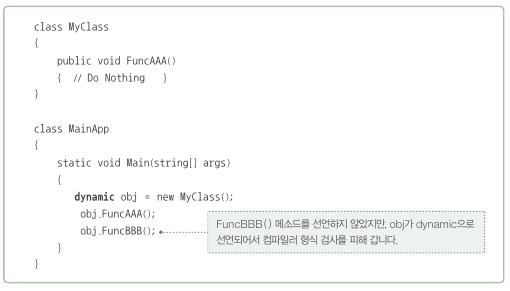 -dynamic 형식은 런타임에 형식추론을 하기 떄문에 메소드들은 오류가 발생하지 않는다.