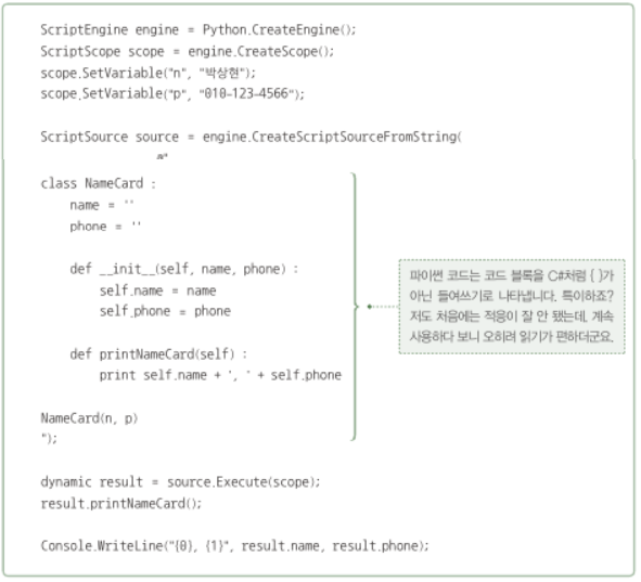 -C#은 동적언어코드와의 상호동작을 지원하고 그것을 dynamic형식을 사용한다.