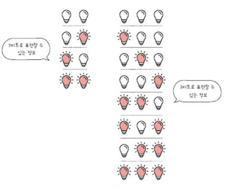 -비트가 2개면 (켜짐,켜짐), (켜짐,꺼짐),(꺼짐,켜짐),(꺼짐,꺼짐) 4가지를 표현할수있음