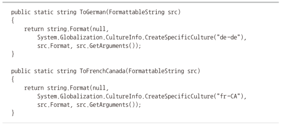 여러 문화권에서 사용하도록 프로그램을 짤 경우 string이 아닌 FormattableString의 객체가 반환될 수 있게
