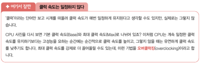 2)클럭 속도: 헤르츠(Hz) 단위를 사용. 1초에 클럭이 몇 번 반복되는지를 나타낸다.