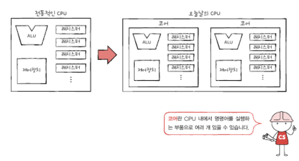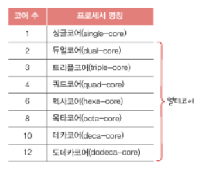 2)멀티코어: 명령어를 실행하는 복수개의 부품. 코어가 여러 개인 코어.