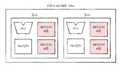 -위 같이 두개의 코어에 4개의 명령어를 처리하는 CPU를 2코어 4스레드라고 한다.