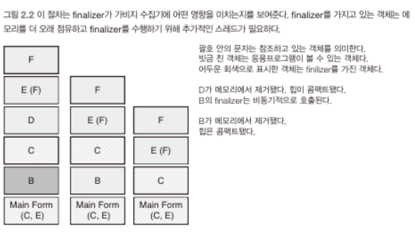 -종료자가 있는 객체는 종료자를 호출해야 함으로 즉각적으로 메모리해제가 이루어지지 않는다.