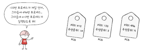 -우선순위는 PCB에 명시되고 적한 순위가 높은 것을 선택하여 처리할 프로세스를