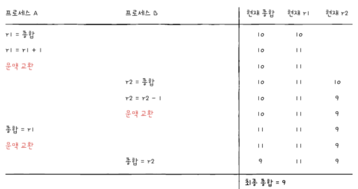3)레이스 컨디션(race condition): 임계구역 임에도 잘못된 실행으로 인해 여러 프로세스가