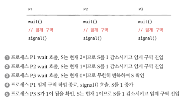 -공유 자원이 여러 개일 떄 접근할 수 있는 프로세스 수를 제한하는 동기화 기법.