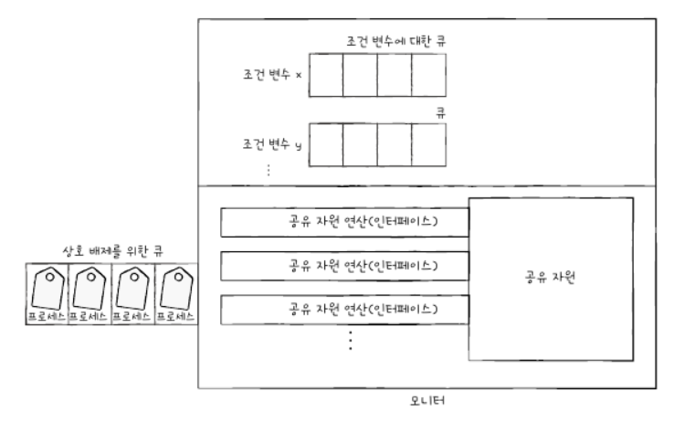 1)정의:공유 자원과 공유자원에 접근하기 위해서 인터페이스(통로)를 두고 묶어 관리하는 동기화 기법.