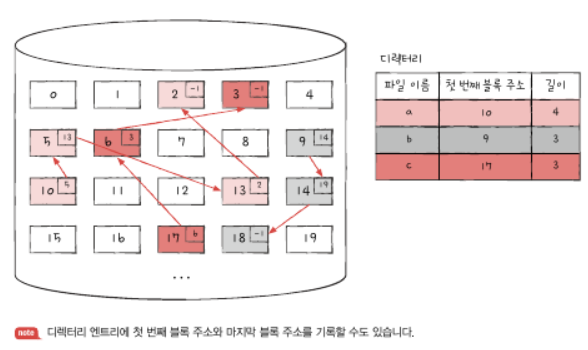 -각 블록 일부에 다음 블록의 주소를 저장하여 다음 블록을 가리키도록 하는 형태의 할당 방식.