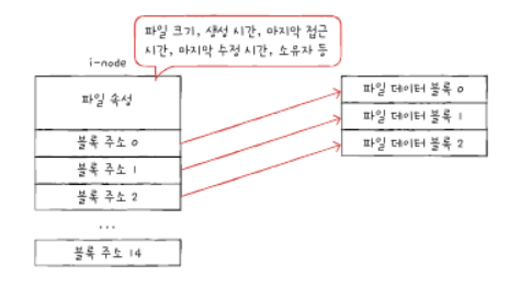 -i-node에는 파일 속성과 열 다섯개의 블록 주소가 담긴다.