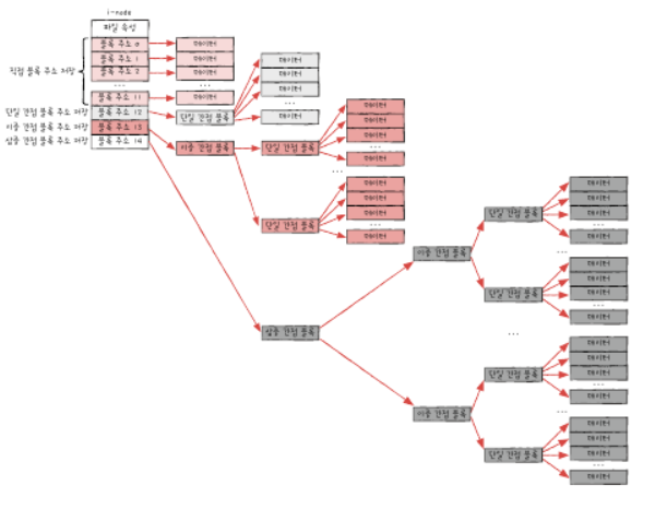 -i-node의 크기는 유한하며 기본적으로 15개의 블록의 주소를 저장하기에 그 이상의 블록의 주소는