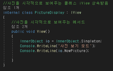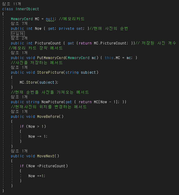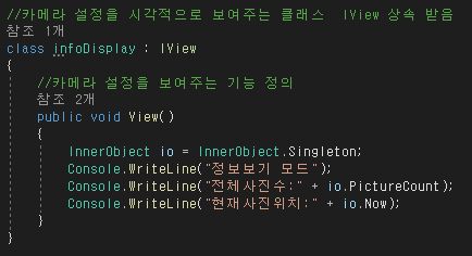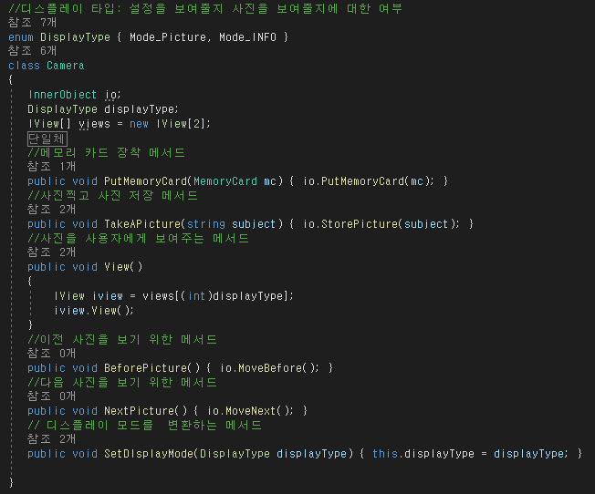 -클래스 구성으로 카메라(단일체), 디스플레이(뷰), 메모리,내부 개체(단일체)로 구성한다.