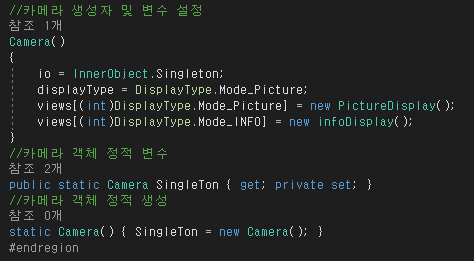 -내부객체 단일체로 작성하여 디스플레이(뷰),메모리,카메라와 상호작용하여 정보를 관리한다.