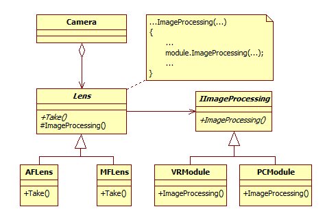 -가교 패턴에서의 추상화 부분은 렌즈, AF 렌즈, MF 렌즈이고 구체적 구현 부분은 모듈과 VR 모듈, PC 모듈이다.